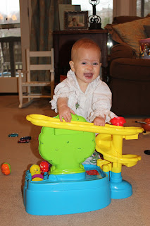 We let the little fella snooze in the car as long as he could.  Of course he woke up pretty cranky as soon as we turned the car off.  He didn't even car if he opened his gifts.  He just wanted to go straight to bed.  We threw him in the tub and were ready to comply when he decided it would be better to wake up!!  Of course!  Thanks to a little Ergo nap at the science center, Jane Claire was in great spirits.  She was all about showing off her pull up skills.  And she even got brave enough to lower herself back down!  Baby girl is on the move!
