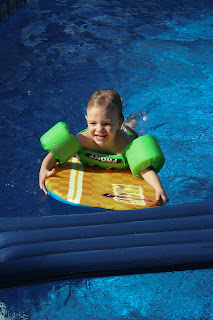 Jane Claire and Gee Gee...Then we headed over to the Malone's to celebrate Jeremy's birthday. The big kids had to get in the pool of course. GranBuddy blew up the big spider float for them. They both thought the air compressor was a little loud!! Ha...