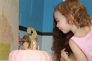 Charlotte blowing out 3 little candles...Monkey Jane came for a visit! Much to our surprise, Charlotte went to say hello! I wonder if it had something to do with the gift MJ had in her hand?!? ;-)